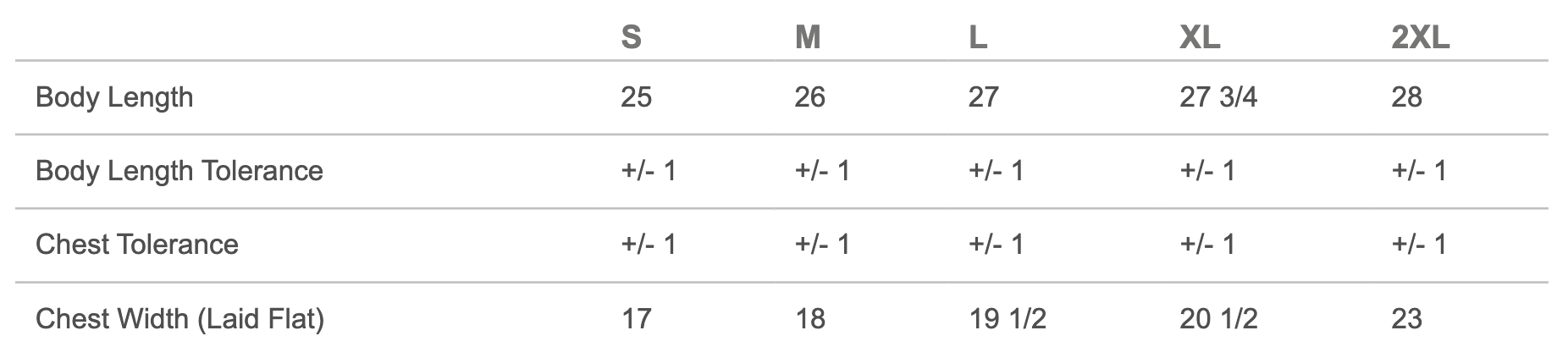Chest Width (Laid Flat) 17 18 19 1/2 20 1/2 23