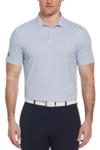 A retro twist! Sleek, moisture-wicking, and sustainably made. The refined repeat print adds style while keeping logos in focus, perfect for work, golf, and beyond. 9-oz, 56/30/14 performance polyester/recycled polyester/elastane. Self-fabric collar. 2-button placket. Double needle hemmed bottom with side vents. Contrast embroidered Pete logo on right sleeve. Moisture wicking. Breathable. UV Block = UPF 50. Classic fit.