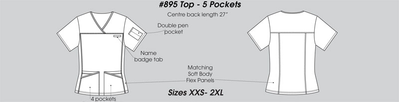 #895 Body Flex Coloured Spandex Top: Double pen pocket on sleeve Colour matching soft stretchy body flex panels Name badge tab 4 front pockets Centre back length 27" Fabric: 65% Polyester / 35% Cotton